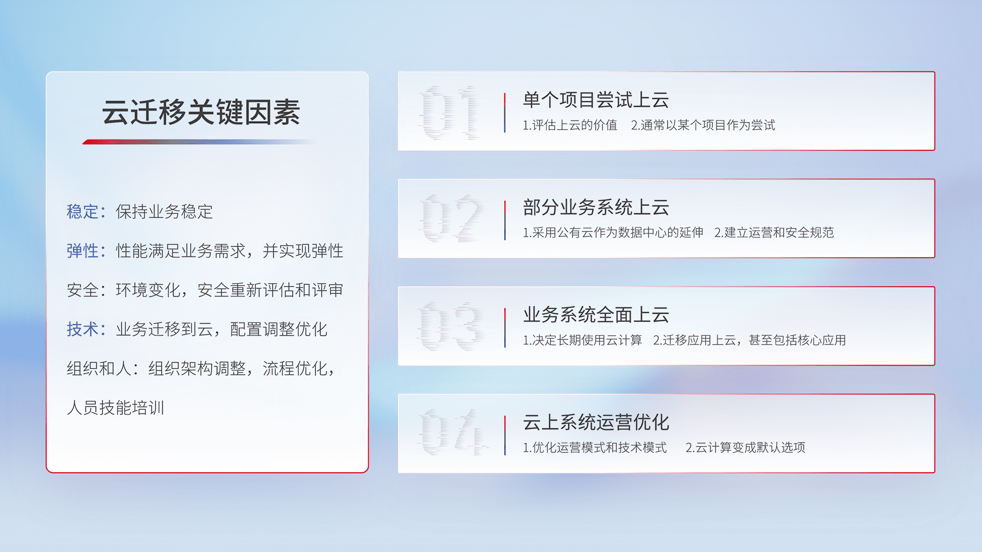 结合实际业务,,,从规划设计、、、云平台选型、、、、云原生改造、、数据迁移、、、、集成交付,,,迁移全过程为客户识别最佳上云路径,,,做好风险识别管理,,,设计网络架构、、、身份权限、、、、安全审计合规、、操作审计、、、、日志审计、、监控告警策略、、多站点容灾设计等,,,,对云上基础设施进行整体规划,,提升IT治理水平,,,以满足弹性、、高可用、、、、高性能的需求。。