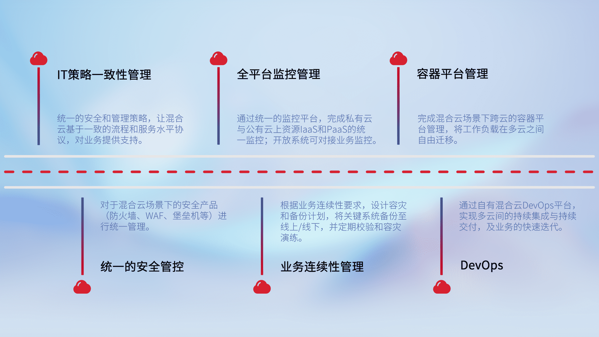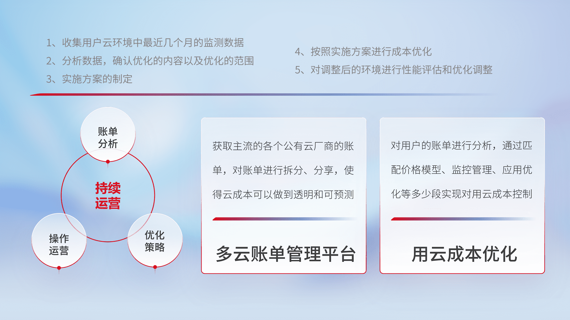 通过多云纳管,,,,以统一的资源数据模型把客户的云资源进行抽象和封装,,,,进而实现对多云资源的统一操作,,,保障云资源管理的可靠性、、、、稳定性与可用性。。量身定制化运维内容,,,配置、、、开发运维、、、、补丁管理、、、、备份、、监控、、、、认证和访问管理、、、、审计和日常巡检等,,,,保障在用云过程中的可靠度,,,稳定度以及高可用率。。