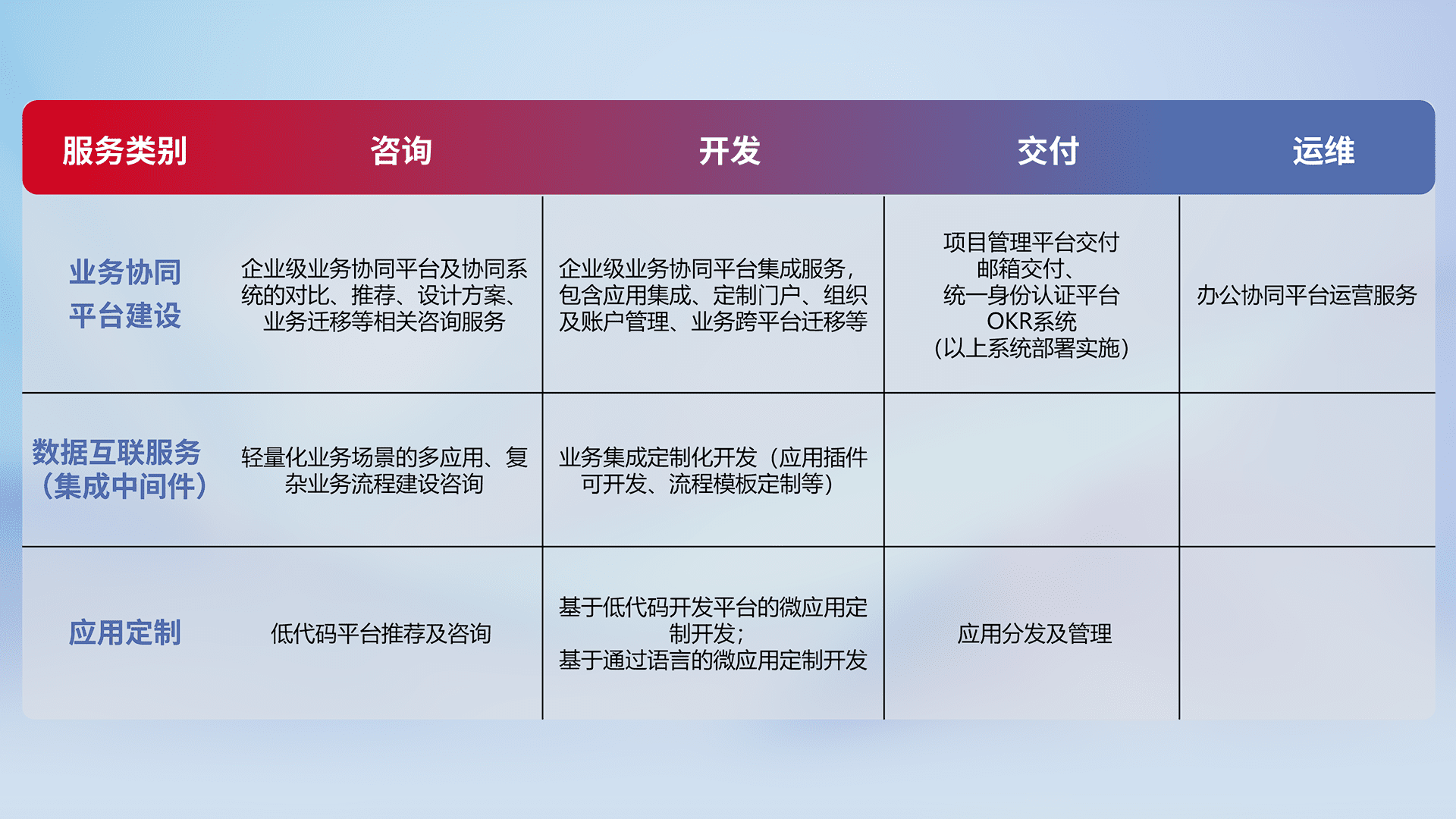 针对钉钉、、、企微、、、IDaas等平台级产品提供产品的规划、、、方案、、、、交付、、、定制化开发等服务,,实现如统一协同办公、、智能客户服务、、、、混合会议管理、、智能数据查询、、、等业务场景,,实现数字化转型。。。